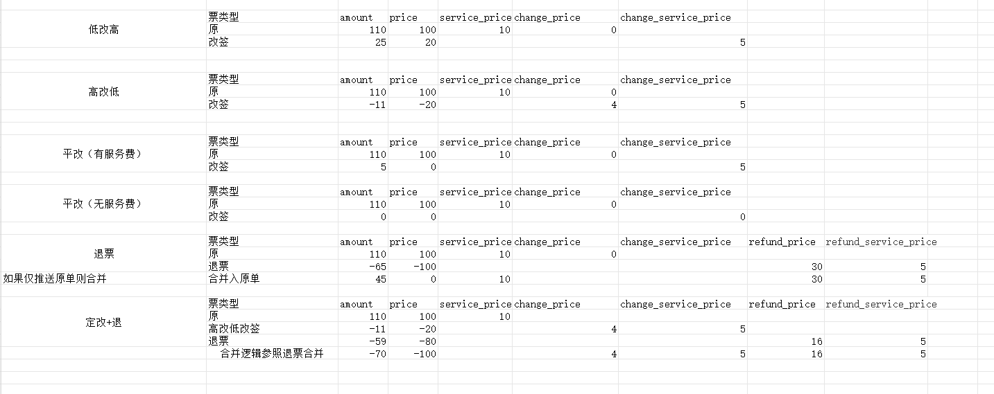 订单金额传值存在负数的情况,在改签和退票的场景下产生两个单号的情况下改签单和退票单存在传负数的情况。简单来说,对于单笔资金流向,如果是客户付给消费服务商,则为正,如果是消费服务商退还给客户,则为负。比如:预定机票,客户付给消费服务商票款1000,price为+1000;后续退票,退票款1000元,但是收取600元退票费,则price为-1000,但是refund_price为600。预定订单总额1000元,退票订单-1000+600元=-400元。多订单号金额计算逻辑参考示例如下: